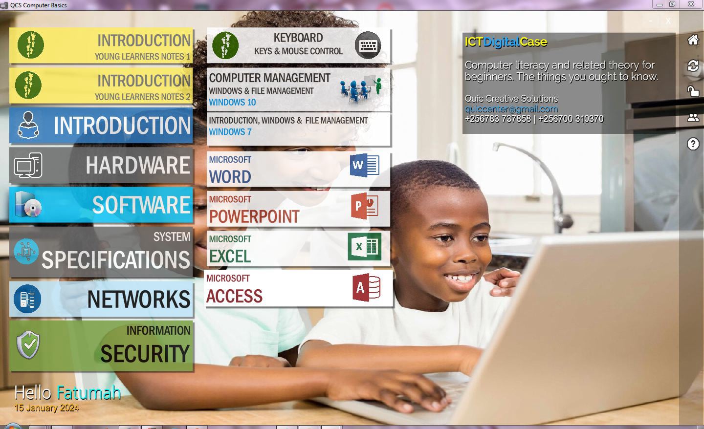 This is my training syllabus for computer literacy. I designed it to be able to make interactive lesson presentations during my training sessions. It covers Microsoft office with video illustrations, important theory, computer management and e-tests. It can be used by any beginner, adult or young or a teaching aid for trainers.